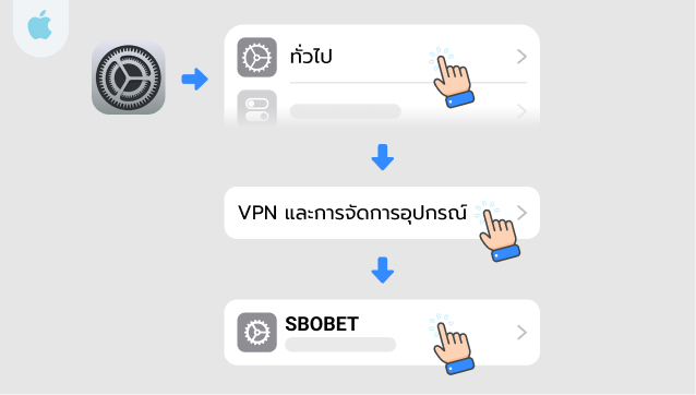 ไปที่ การตั้งค่า > ทั่วไป > VPN และการจัดการอุปกรณ์ จากอุปกรณ์ของคุณ จากนั้นกด SBOBET เพื่อทำการดาวน์โหลดโปรไฟล์